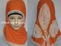 Jilbab segitiga daun, berbahan kaos rayon berbentuk segitiga dengan hiasan berbentuk daun di bagian belakang jilbab.