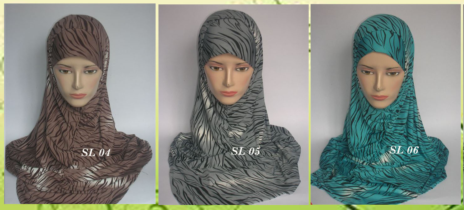 Syria Leopard, jilbab instant langsung pakai dengan motif leopard dengan bermacam pilihan warna yang menarik. Panjang jilbab menutup dada (M)